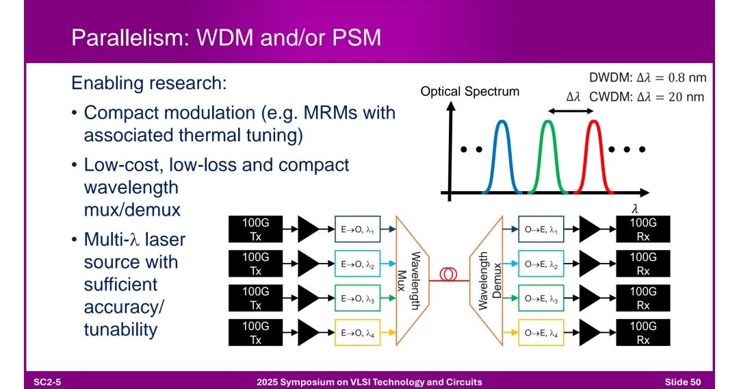 ◆ 并行技术:WDM(波分复用,DWDM Δλ=0.8nm,CWDM Δλ=20nm)和PSM(并行单模)提升带宽,需低损耗波长复用器、可调谐多波长激光器支持。