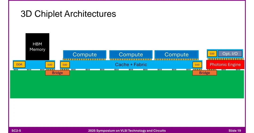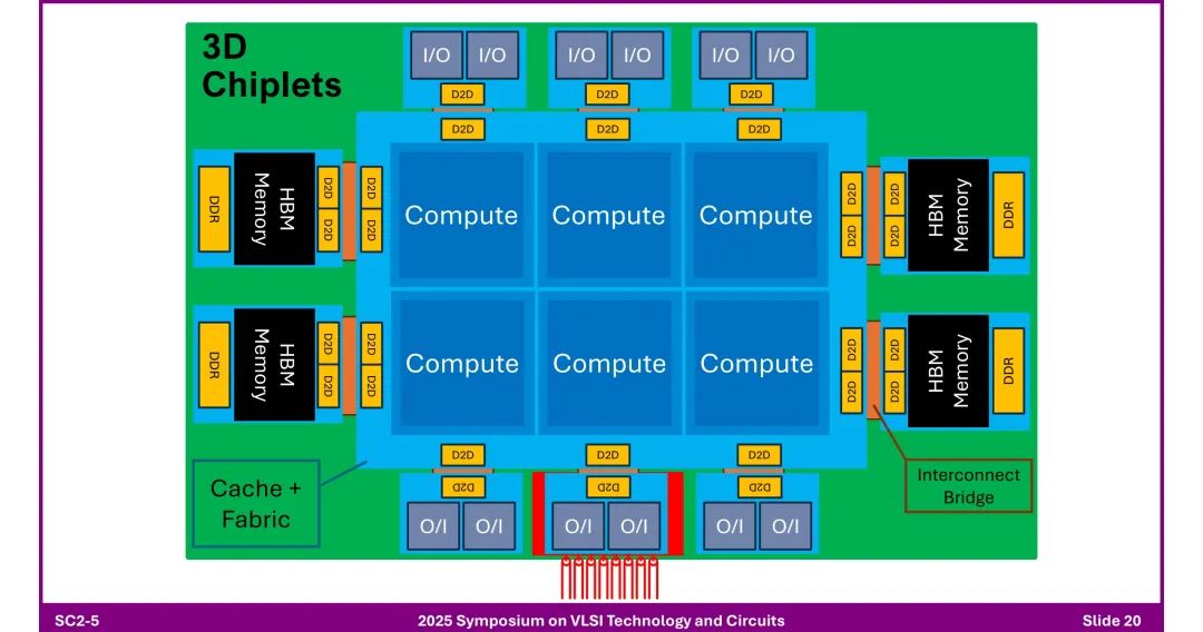◆ 功能扩展:通过D2D接口组合不同功能芯粒(计算、内存、I/O),支持HBM内存高密度集成。 3. 3D芯粒架构 ◆ 堆叠计算层、内存层(HBM、DDR),通过D2D接口实现层间互联,集成“Cache + Fabric”提升数据调度效率。