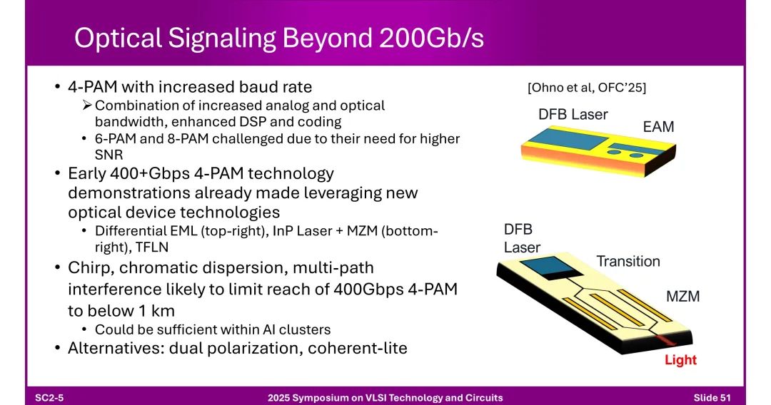 ◆ 200Gb/s以上技术:PAM4通过提升波特率、优化DSP实现,已有400+Gbps演示(采用差分EML、InP激光器+MZM等),但受色散限制,传输距离<1km(满足AI集群内需求)。 ◆ 潜在替代方案:双偏振、简化相干传输技术。