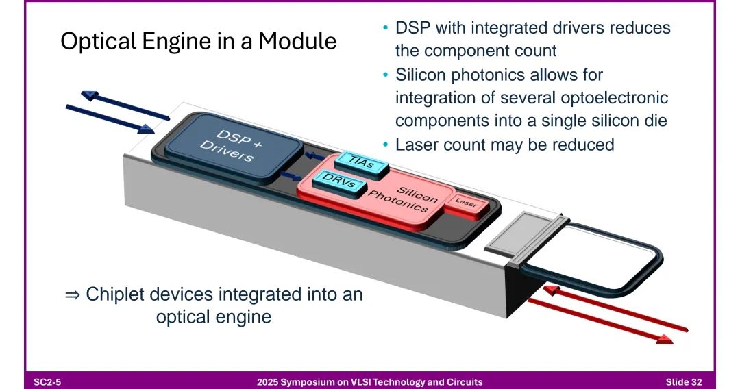 ◆ 光学引擎:DSP集成驱动器,通过硅光子技术将光电器件集成到硅基芯片,减少激光器数量,支持芯粒化集成。