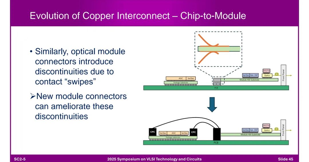 ◆ 芯片到模块(C2M):连接器接触“swipes”引入不连续,需通过新型连接器设计缓解。