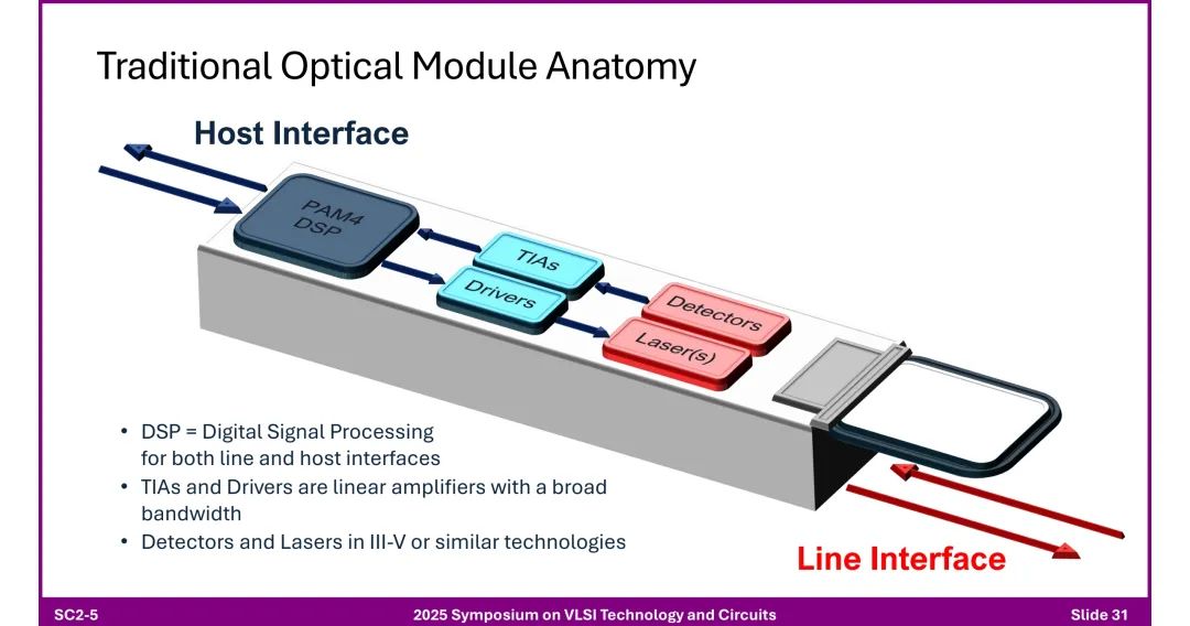 七、光模块的芯粒化与优化 1. 传统与新型光学模块 ◆ 传统模块:含DSP PAM4、驱动器、激光器(III-V材料)、TIAs(跨阻放大器),组件多、成本高。