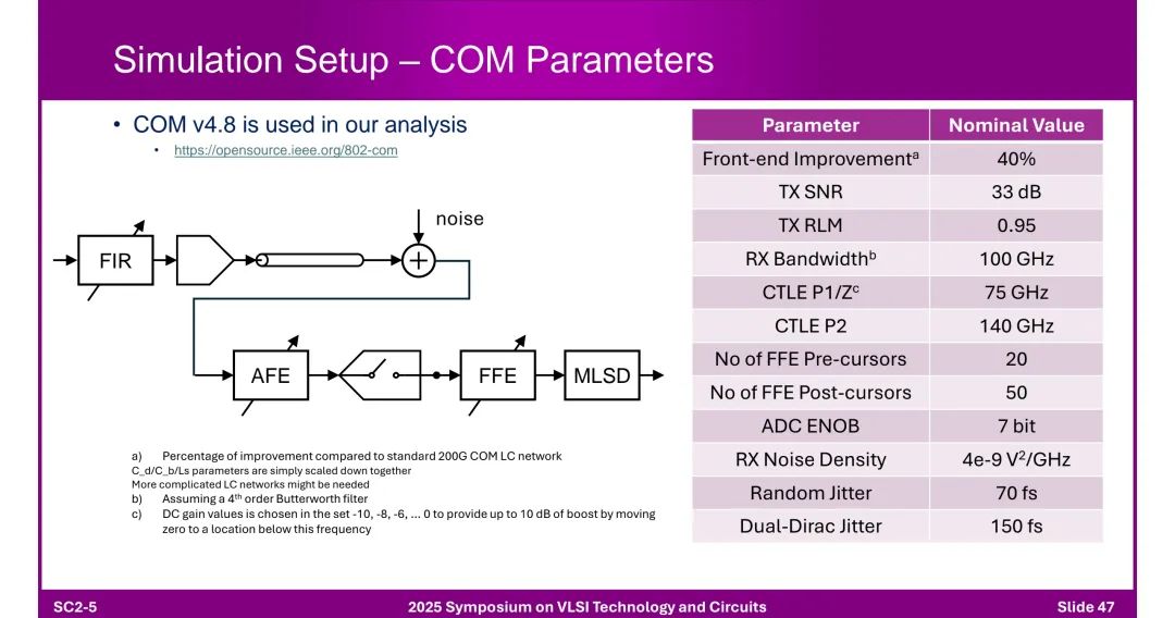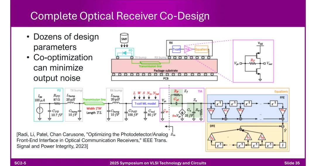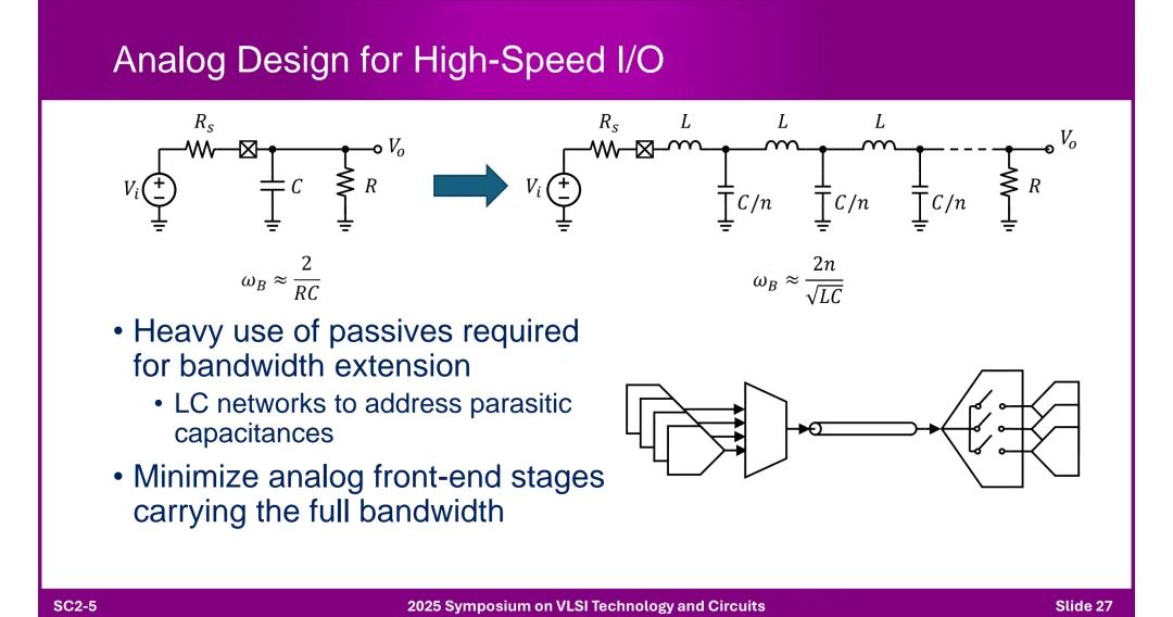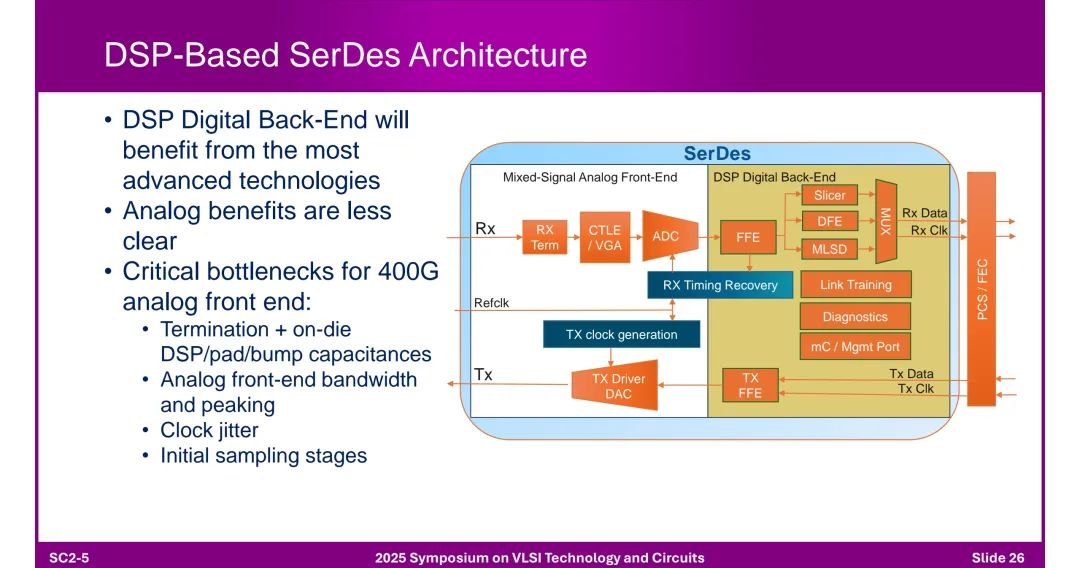 ◆ 结构组成: - 模拟前端(Mixed-Signal AFE):含CTLE(连续时间线性均衡器)、FFE(前馈均衡器)、ADC等。 - 数字后端(DSP):负责时序恢复、FEC(前向纠错)、链路训练等,受益于先进工艺节点。 ◆ 瓶颈:400G模拟前端面临终端电容、带宽限制、时钟抖动等问题。 2. 模拟设计关键技术