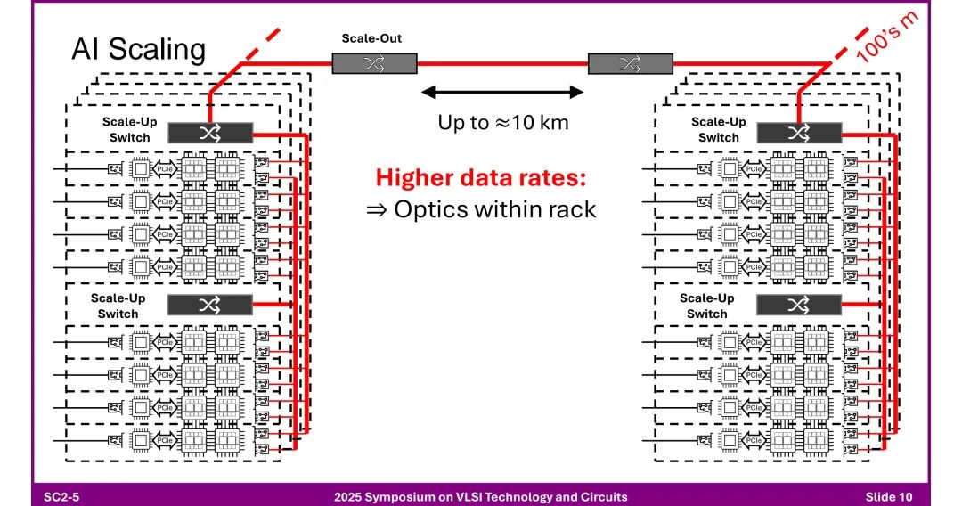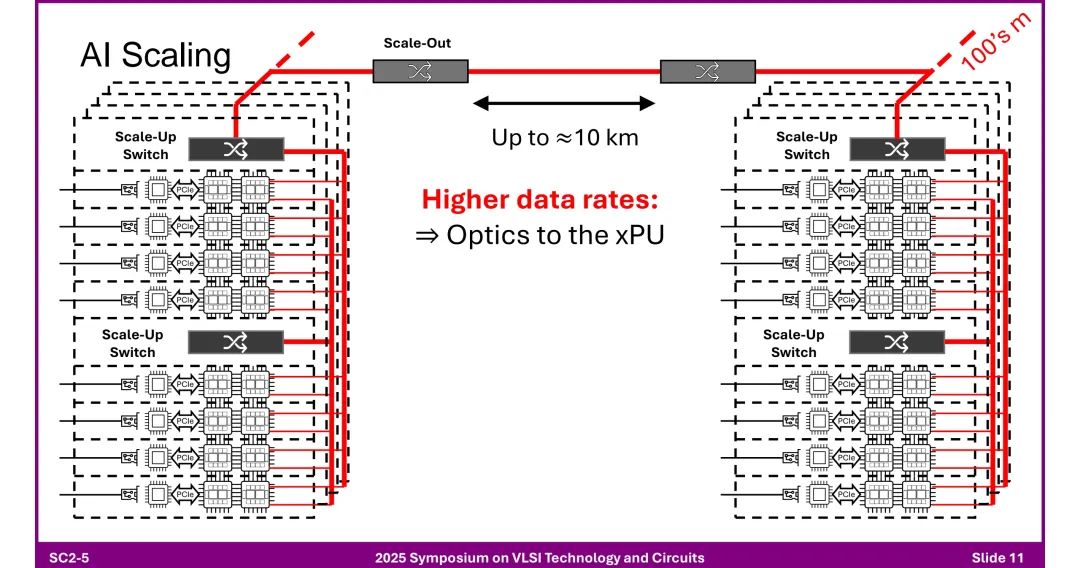 - 采用光学连接,支持数万至数十万节点(如Infiniband、Ethernet/UltraEthernet),通过“Scale-Out Switch”实现扩展。 ◆ 多机架及数据中心间: - 传输距离达10km,需引入光学元件,相干光学技术(Coherent Optics)开始应用于短距离场景(传统用于长距通信)。 ◆ 未来趋势:更高数据速率推动机架内光学渗透(“Optics within rack”),甚至直接连接到xPU(“Optics to the xPU”)。