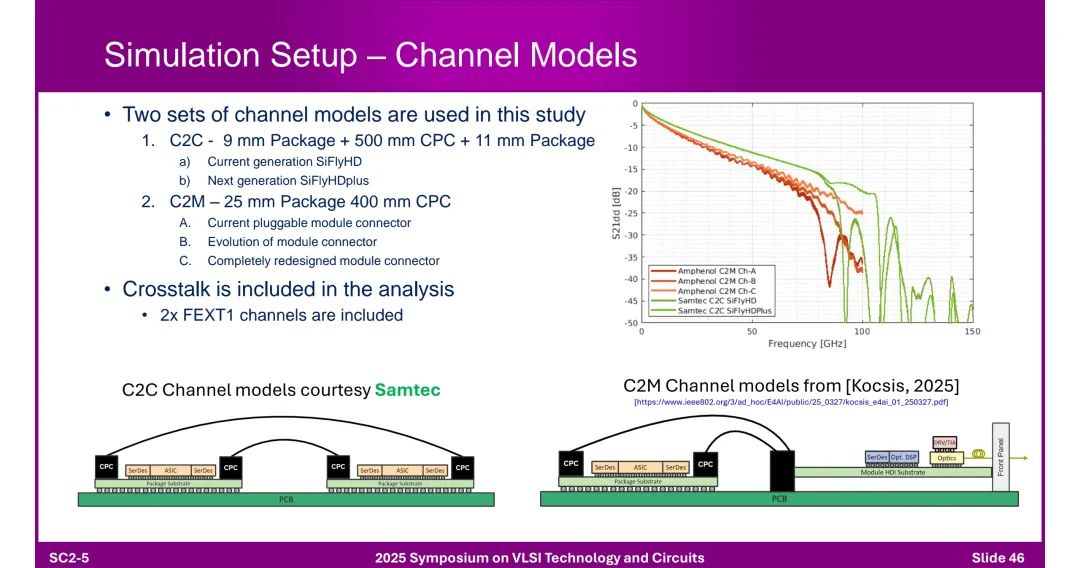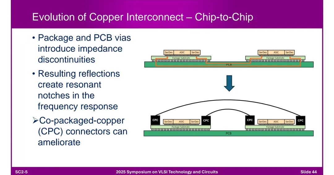 九、铜互连与高速电气/光学可行性 1. 铜互连的演进 ◆ 芯片到芯片(C2C):封装和PCB过孔导致阻抗不连续,共封装铜(CPC)连接器可改善,仿真模型涵盖9mm封装+500mm CPC+11mm封装场景。