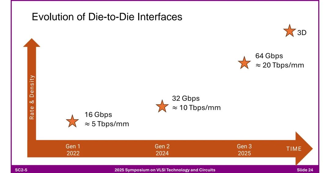 ◆ 核心特性: - 可扩展架构(16/32/64位模块),支持测试性(BIST、环回、眼图监测)。 - 兼容标准与先进封装,跨工艺节点互操作,支持低延迟相干连接。 - 应用场景:连接计算芯粒、内存芯粒(HBM)、I/O芯粒,是芯粒设计的基础协议。 2. 性能演进路线