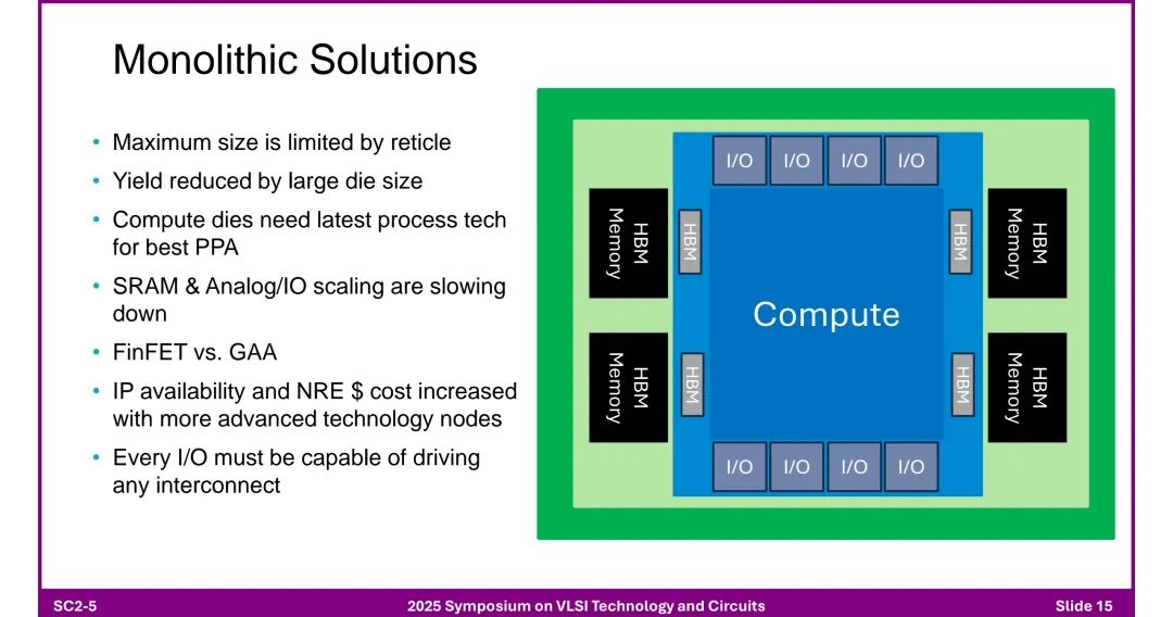 ◆ 核心需求:更高每通道数据速率、更长传输距离、更低延迟,以及光学连接在机架内的普及。 四、芯粒架构:突破单芯片限制的关键 1. 单片解决方案的局限性 ◆ 物理限制:最大尺寸受掩模版(Reticle)限制,大芯片良率低。