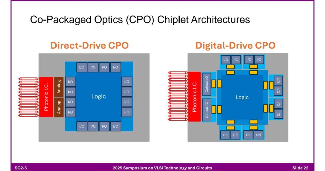 ◆ 引入光引擎(Photonic Engine):将光学SerDes与芯粒结合,通过OIO实现高密度光互联。 4. 共封装光学(CPO)芯粒 ◆ 两种架构 - 直接驱动CPO(Direct-Drive CPO):模拟电路与光子IC直接连接。