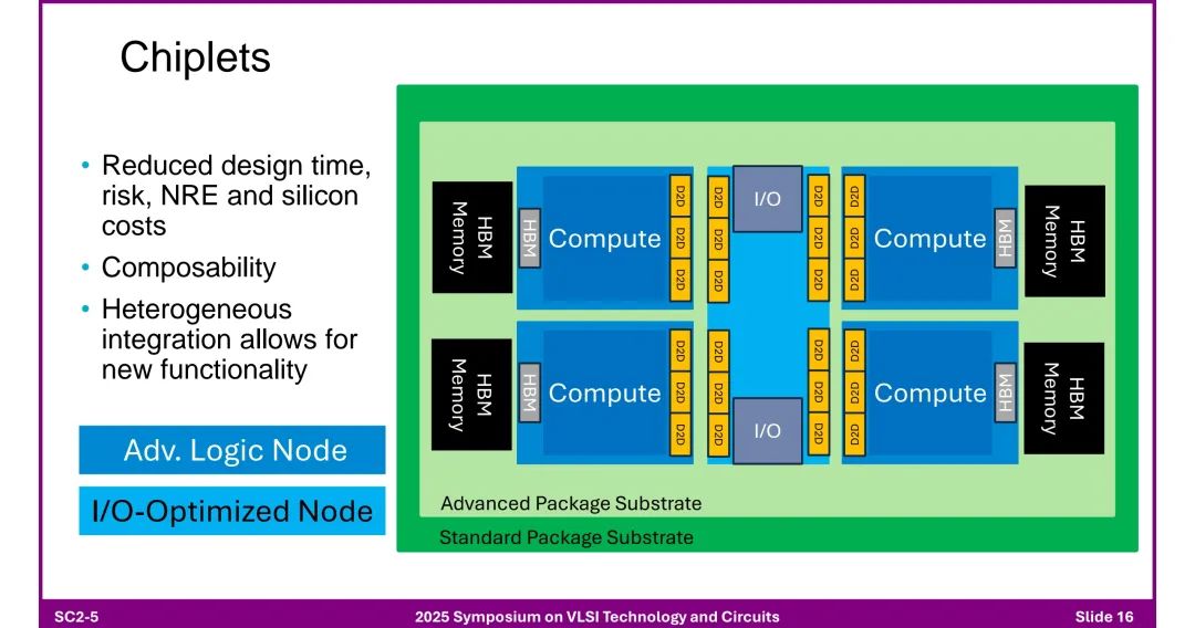 ◆ 设计约束:所有I/O需兼容任意互连,灵活性差。 2. 芯粒(Chiplet)架构的优势 ◆ 成本与效率:降低设计时间、风险及硅成本,支持异构集成(如先进逻辑芯粒+IO优化芯粒)。