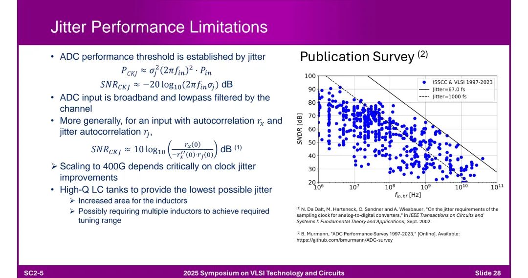 ◆ 带宽扩展:依赖LC网络抑制寄生电容。 ◆ 抖动性能:时钟抖动直接影响ADC性能,需通过高Q值LC谐振腔降低抖动(目前最佳水平达67 fs,1997-2023年从1000 fs大幅改进)。