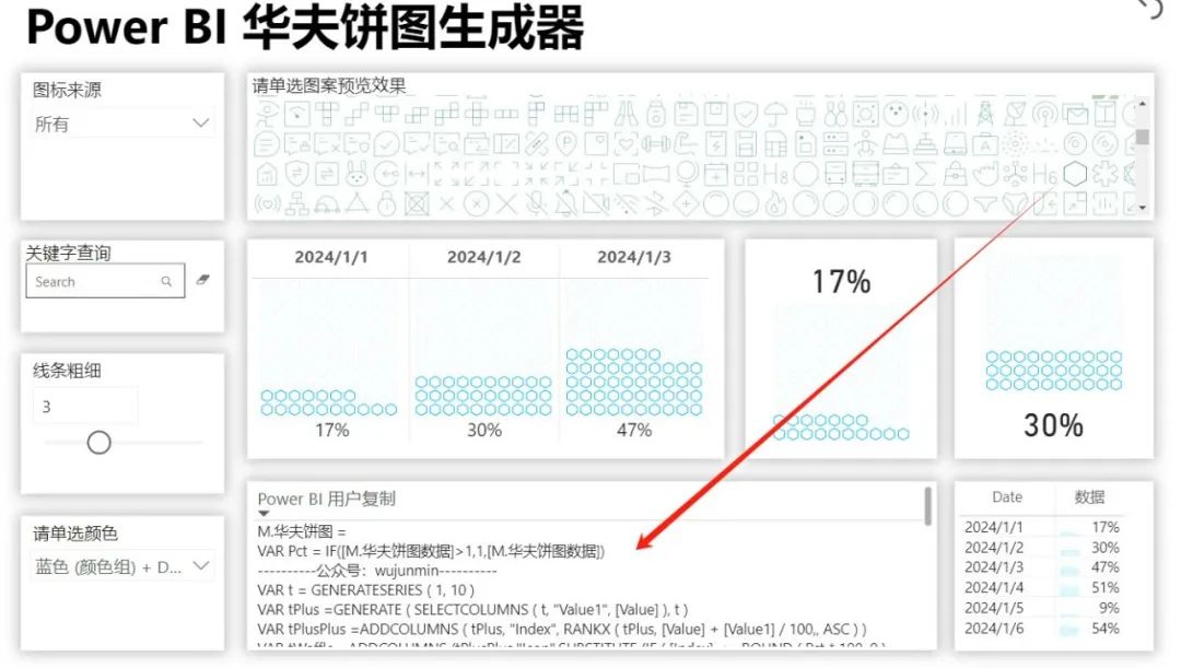 在线选择图标、颜色,复制SVG度量值到你的模型,度量值中的Pct替换为模型中的百分比指标: