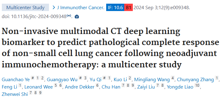 2024年一项发表于《Journal for ImmunoTherapy of Cancer》的多中心研究显示,通过术前平扫+增强CT构建的深度学习模型(LUNAI-fCT),可无创、精准预测患者病理完全缓解(pCR),为临床决策提供重要参考。