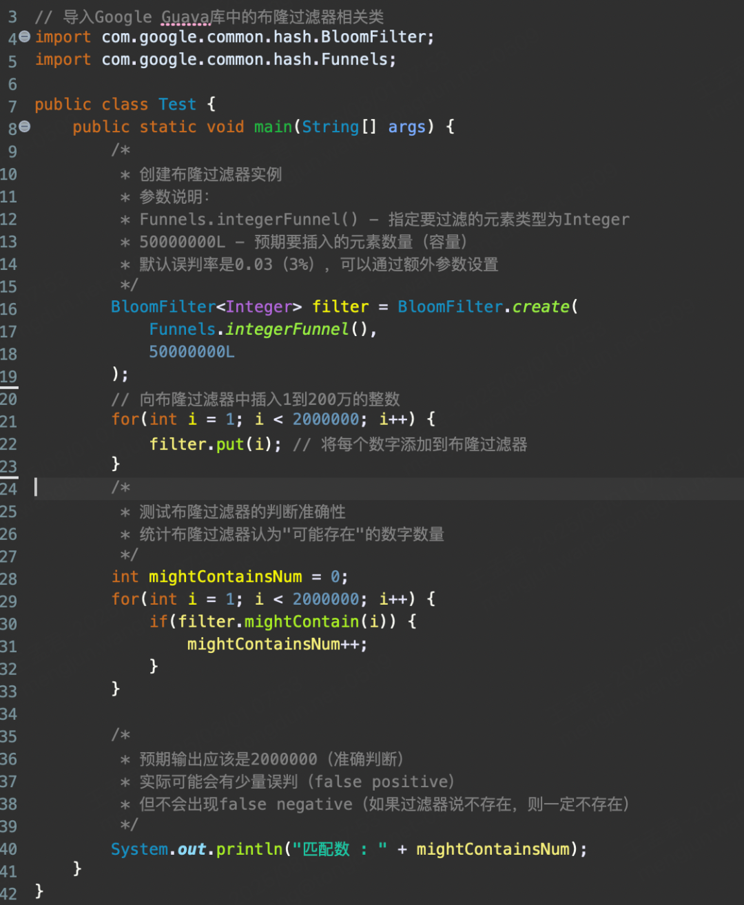 布隆过滤器可以使用Guava来做,一个简单的示例如下: