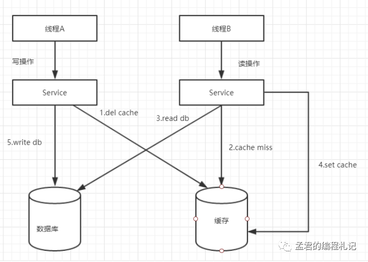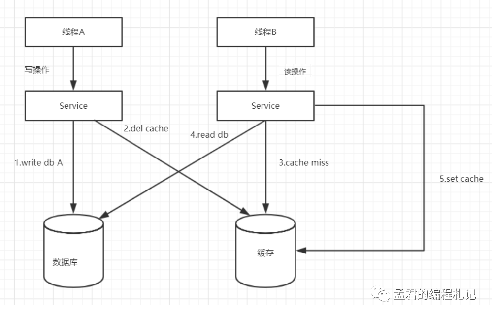 该种处理方式基本没有很大的并发问题,其造成脏数据的情况相对概率相对较低,因为这个条件需要发生在读缓存时缓存失效,而且并发着有一个写操作。