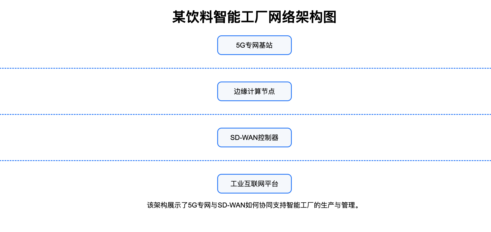 在某饮料智能工厂,5G专网与SD-WAN技术的结合形成了一种混合型网络架构。以下是具体部署方案。