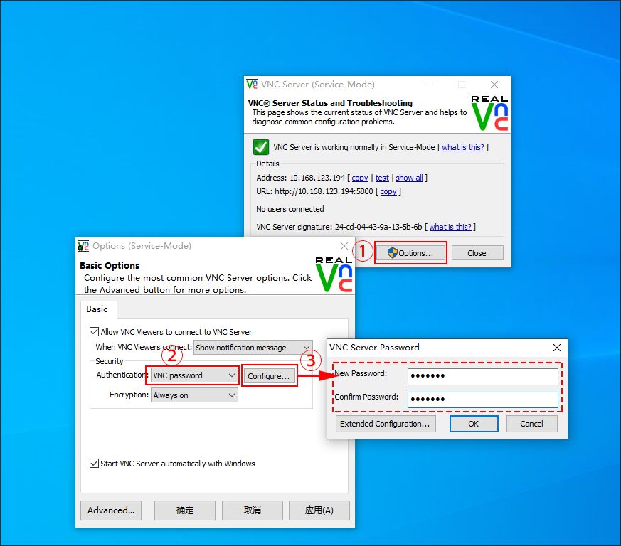 (1)RealVNC Server安装完成后,点击【Options】,选择【VNC password】,点击【Configure】设置RealVNC Server的远程密码。