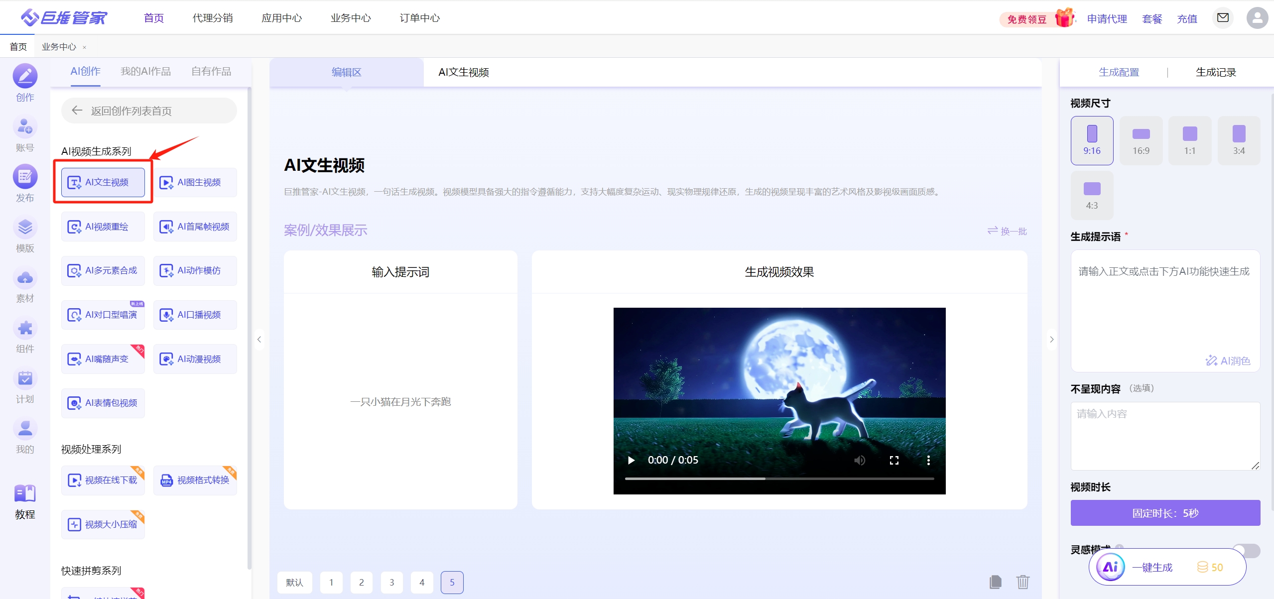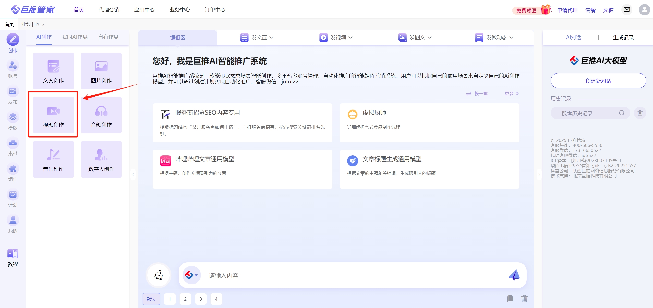 说到这儿,我得给大家推荐一个我最近发现的宝贝——巨推管家AI文生视频生成器。想要用它的话,你只需在百度搜索“巨推管家”,然后点击进入官网页面,点击左侧菜单栏里的“创作”,再选择“AI创作”,就能在里面找到“视频创作”板块下的这款神器啦!它的优点简直不要太多:首先就是智能程度高,你只需要输入一段文字描述,它就能自动匹配场景、角色还有配乐,一键生成高质量的视频;而且操作界面的设计也非常人性化,即便是新手也能轻松上手。当然咯,要说缺点也不是没有,比如有时候生成的某些特效可能不是特别符合我的预期,需要手动调整一下参数才能达到理想效果。但这丝毫不影响我对它的喜爱之情,毕竟瑕不掩瑜嘛!