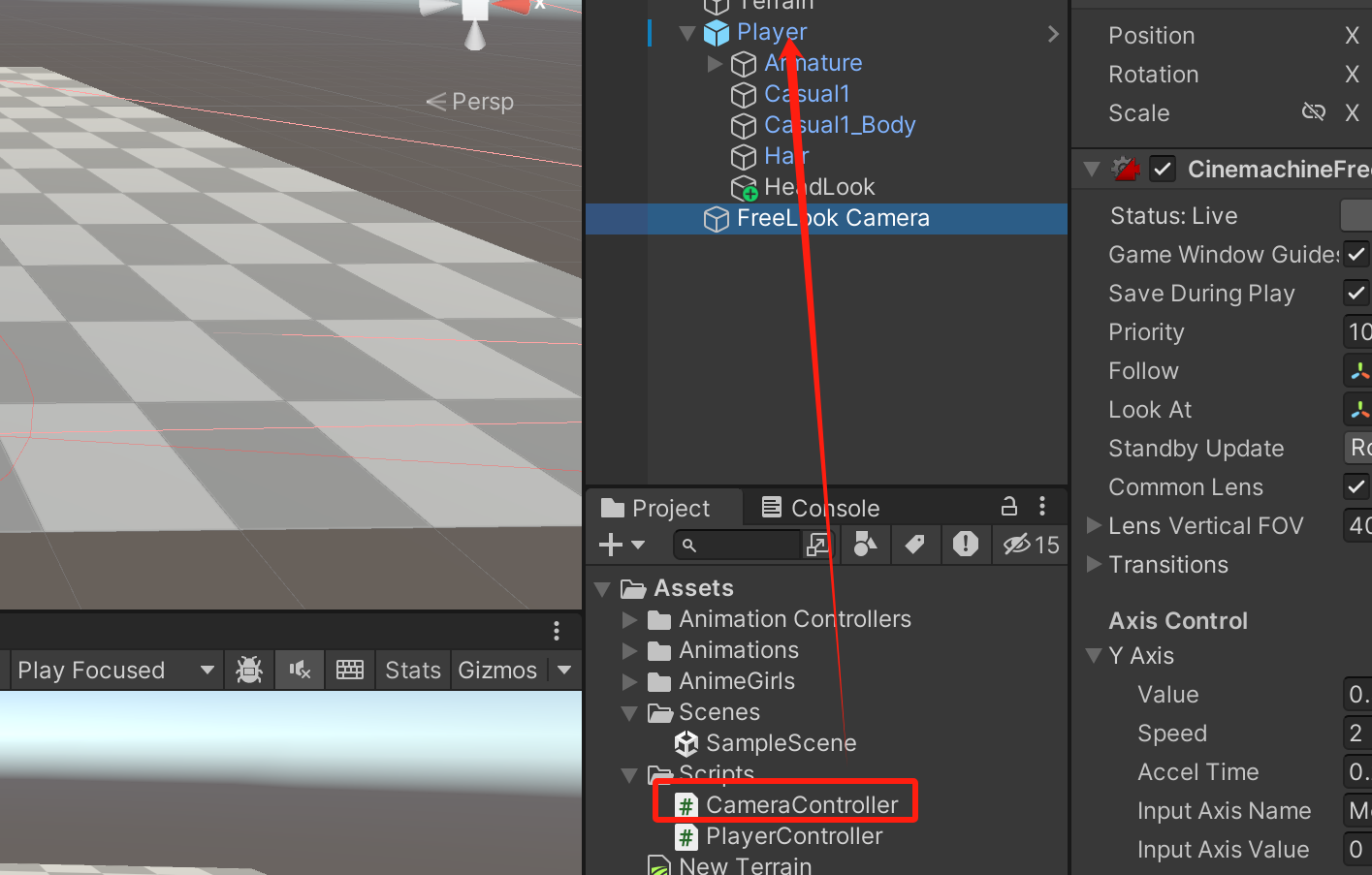 2.在自由摄像机里有一个Follow和LookAt。Follow:我们把角色拖拉过去。LookAt:我们就把角色的头部的“面朝向的点”拖拉过去。