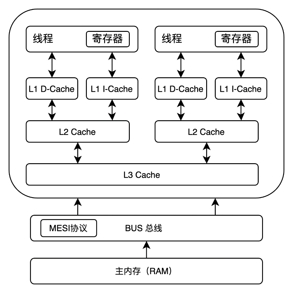 上述的操作是通过总线嗅探和总线仲裁来实现。而基于总线嗅探和总线仲裁,现代处理器逐渐形成了各种缓存一致性协议,例如 MESI 协议。