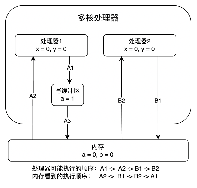 3)假设处理器A和B,都没及时回写变量a和b值到内存。那么这时结果是:x等于0,y等于0;