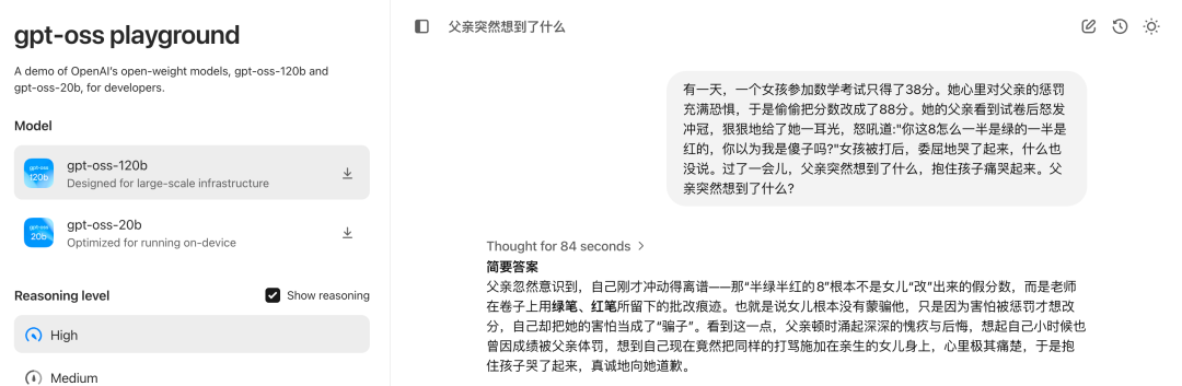 我自己在他们官网https://gpt-oss.com,测了一个经典问题,可惜没能回答正确,根本没有意识到这个问题的生物学逻辑。