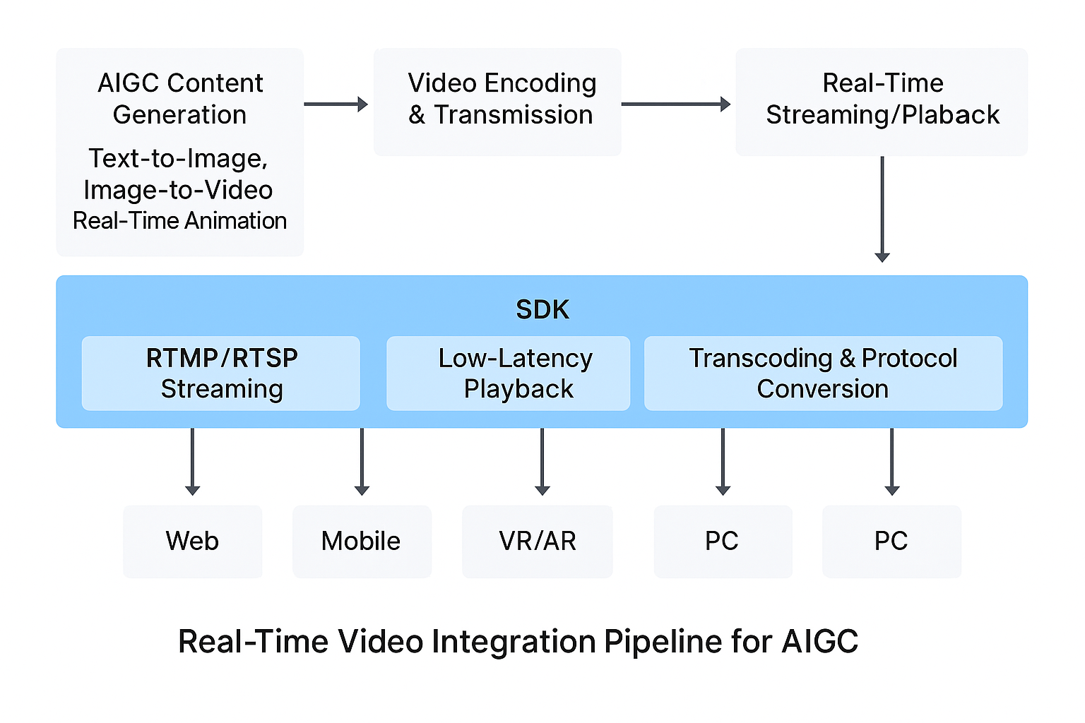 在这一架构中,大牛直播SDK凭借其成熟稳定的视频采集、编解码、传输与播放能力,成为构建“AIGC感知—生成—呈现”闭环的关键基础模块。本文将围绕AIGC系统对视频链路的严苛需求,深入解析大牛直播SDK如何提供可靠的实时支撑能力,并推动生成式AI从实验走向工程化落地。