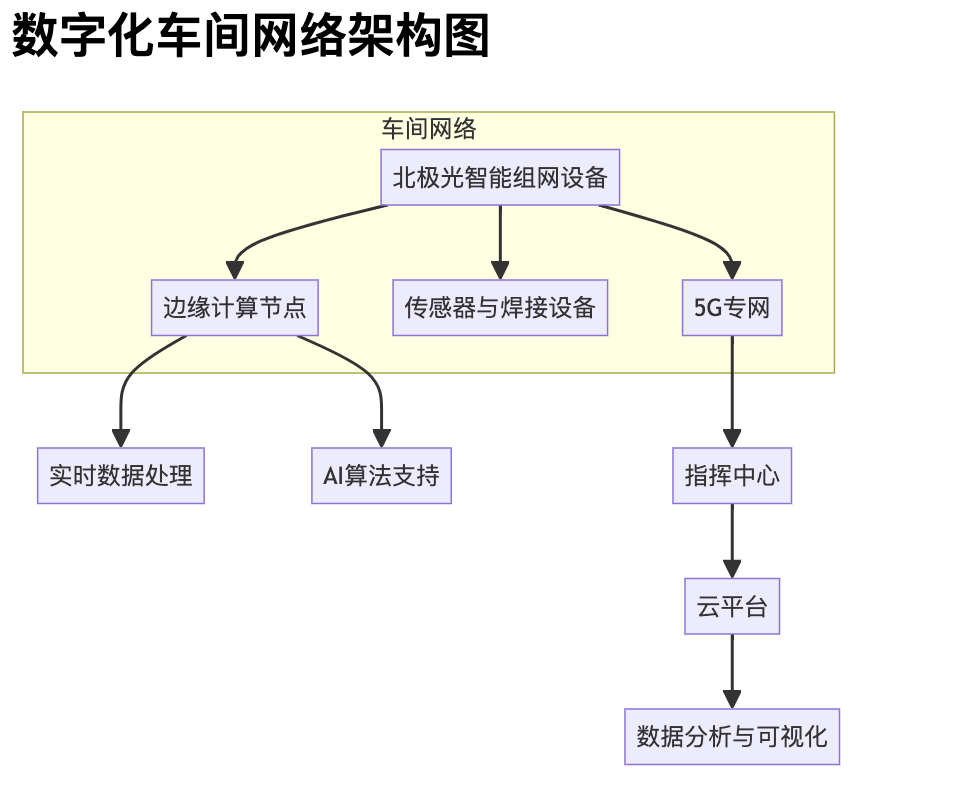 部署智能组网设备搭建的5G专网以及边缘计算平台,确保低延时通信(解析周期4ms)。通过动态路由选择最佳路径(如5G或本地专网),为焊接过程的毫秒级数据采集提供支持,同时满足生产环境的动态扩展需求。