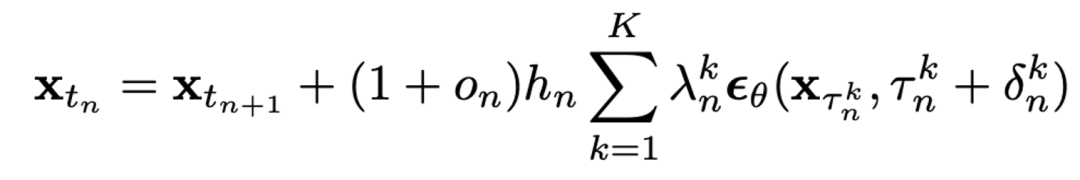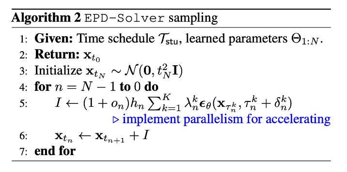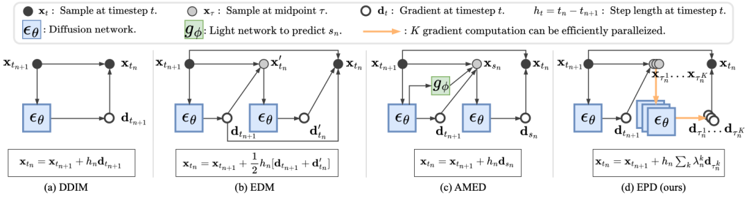 EDM 和 AMED 在 DDIM 的基础上,增加了一次额外梯度评估( tₙ 与 sₙ )来提升积分近似精度。该方法的核心动机是将额外梯度评估扩展到多个时刻,提出 EPD-Solver: