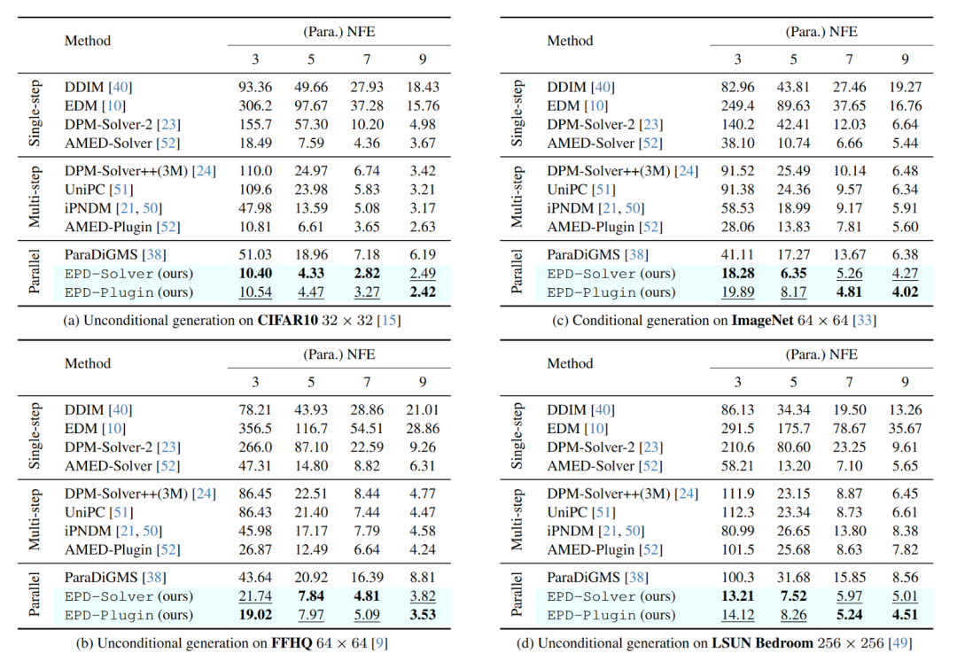 综上,EPD-Solver 突破了扩散模型在低延迟采样时速度与图像质量的核心权衡瓶颈,提供了一种高效、实用且易于部署的新方法。其在多个图像生成基准上显著优于现有先进求解器的实验表现,有力证明了并行计算是推动扩散模型高效采样发展的一个极具潜力的研究方向。