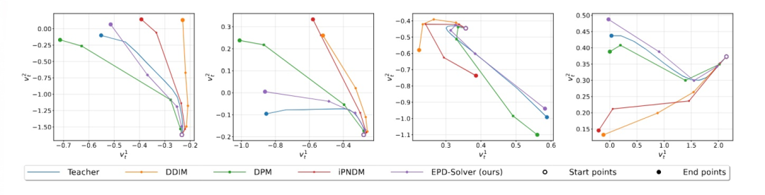 通过可视化两个随机像素在生成过程中的演变路径,可以观察到 EPD-Solver 的轨迹与「教师」轨迹展现出高度的一致性。相比之下,DDIM、DPM-Solver 和 iPNDM 等其他求解器的轨迹相比教师轨迹明显偏离。