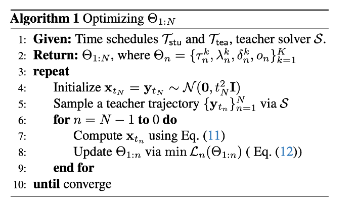 1. 教师轨迹生成:采用高精度 ODE 解算器(如 DPM-Solver)在扩展时间表 𝒯ₜₑₐ 上生成参考状态;