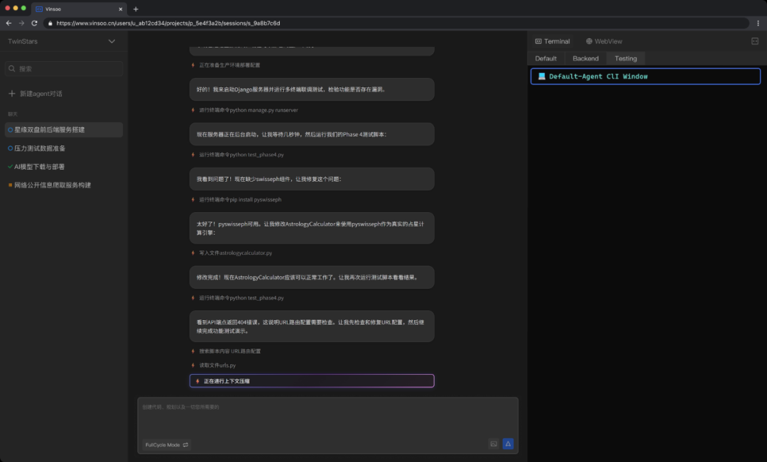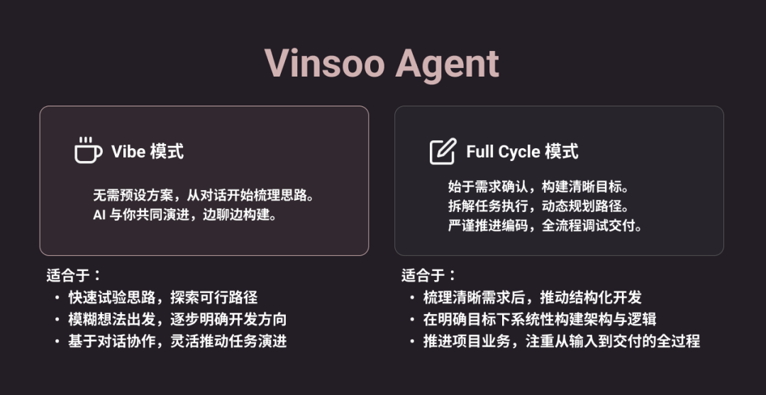 前台的开发 IDE 永远是最贴合开发者的软件,是他们与智能系统交互的第一入口。在聚焦云端多 Agent 智能协同与自动化编程的同时,夯实本地开发体验依然至关重要。为此,Vinsoo 推出了自研 AI IDE,进一步优化端云互补的「双栖开发范式」。同样,本地 IDE 也提供了 Vibe Mode 和 Full Cycle Mode 两种模式。