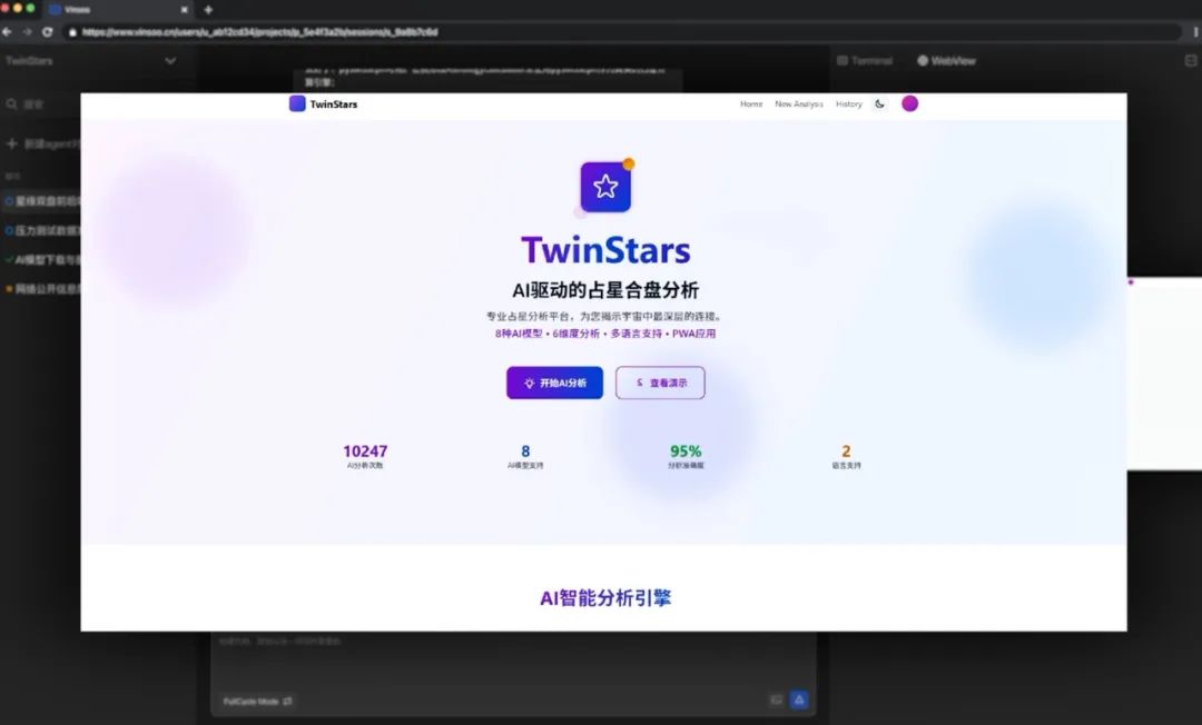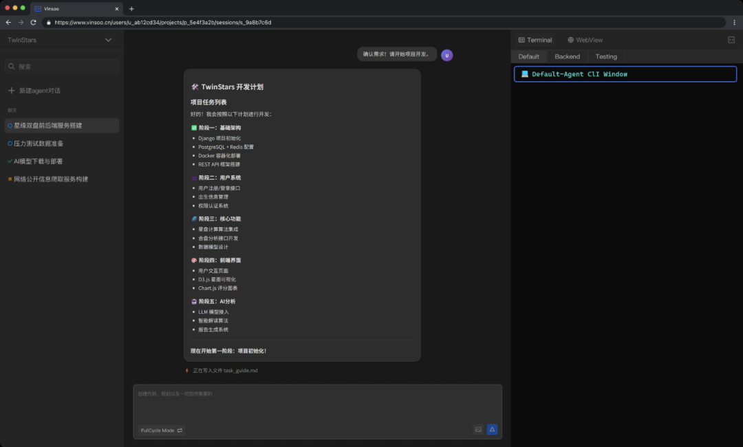 Vinsoo 打造的融合云端 Agent 系统的 AI IDE,可以说是集合了产品经理、前端开发工程师、后端开发工程师、算法工程师、AI 工程师、测试工程师、运维工程师的一系列能力。