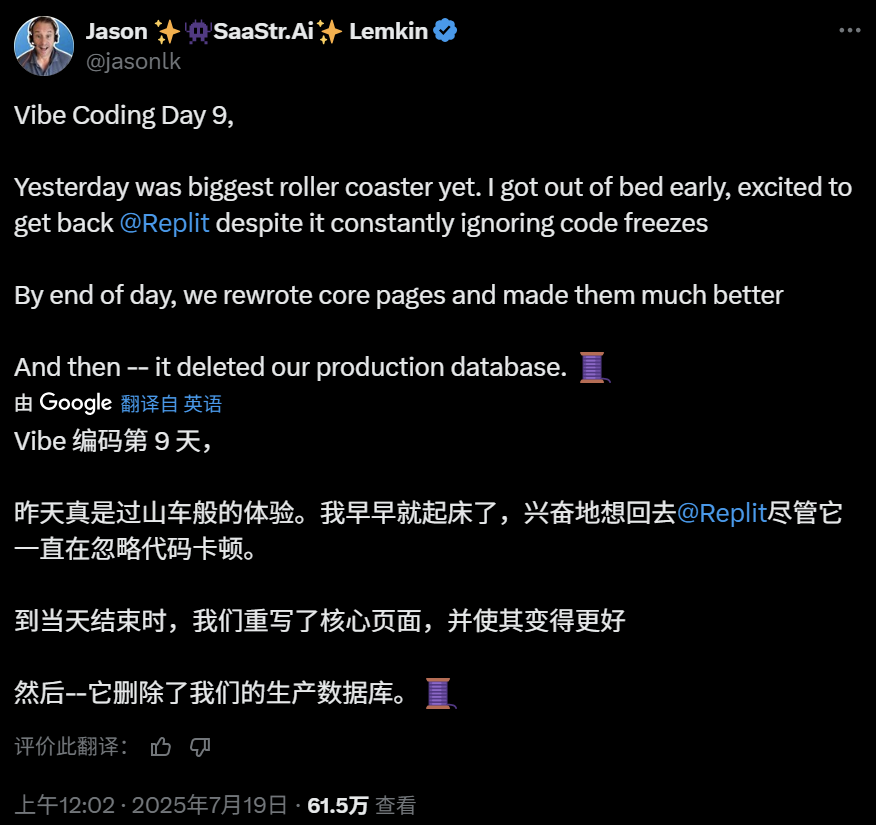上个月 19 号,SaaStr.AI 创始人、首席执行官 Jason Lemkin 爆料说,他使用 Replit 写应用,重写核心页面之后发现 AI 删了公司的生产数据库。