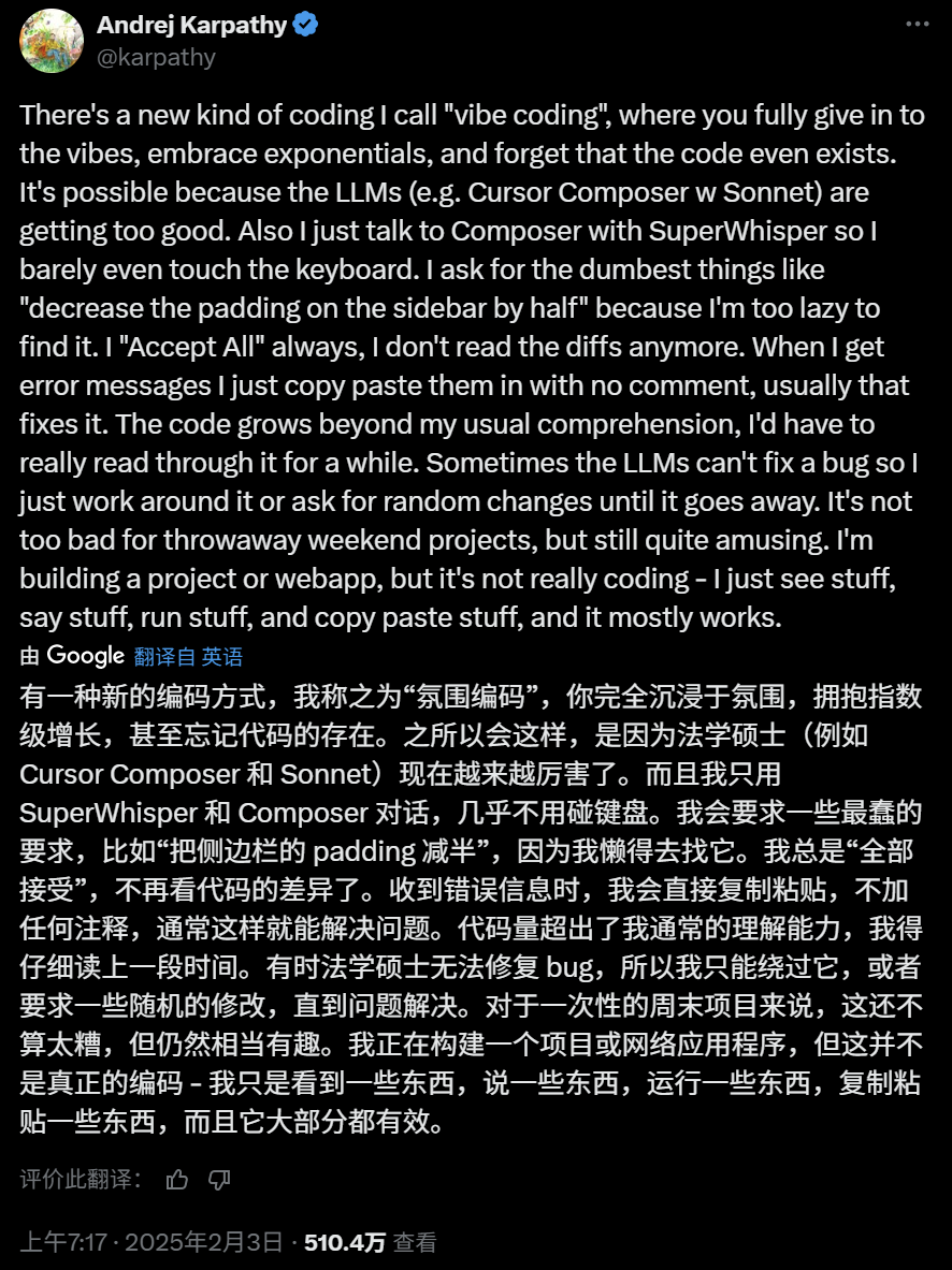 今年 2 月,Andrej Karpathy 在给氛围编程下定义的时候,表示这意味着鼓励开发者忘掉代码,进入开发的氛围其中,其核心在于通过自然语言交互与 AI 协作完成软件开发的过程。现在,开发者不再直接编写或审查代码,而是专注于高层次的产品构想和功能迭代。