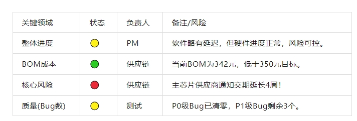 这个仪表盘成为我们每周例会的“指挥棒”,让所有人都能在第一时间了解项目的健康状况,并聚焦于最紧急的问题。当“主芯片交期延长” 这个红色警报亮起时,我们立即启动了风险登记册中的备用方案。