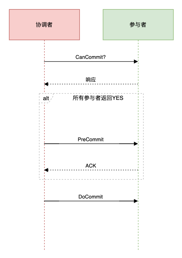 3PC在2PC基础上增加预提交阶段,并引入超时机制: