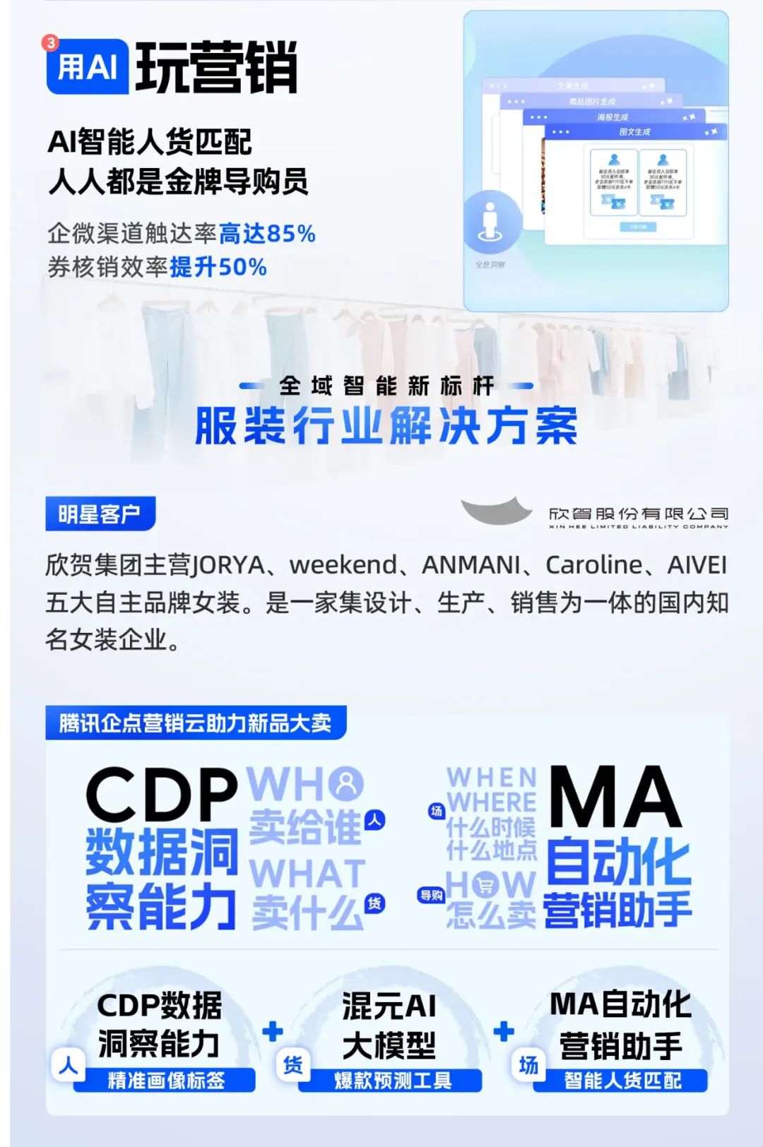 当服装行业还在内卷“人找货”时,欣贺集团已经用AI画出‘货找人’的增长航线,通过AI来“找对人”“盘好货”“玩营销”,成长为全域智能营销的新标杆。