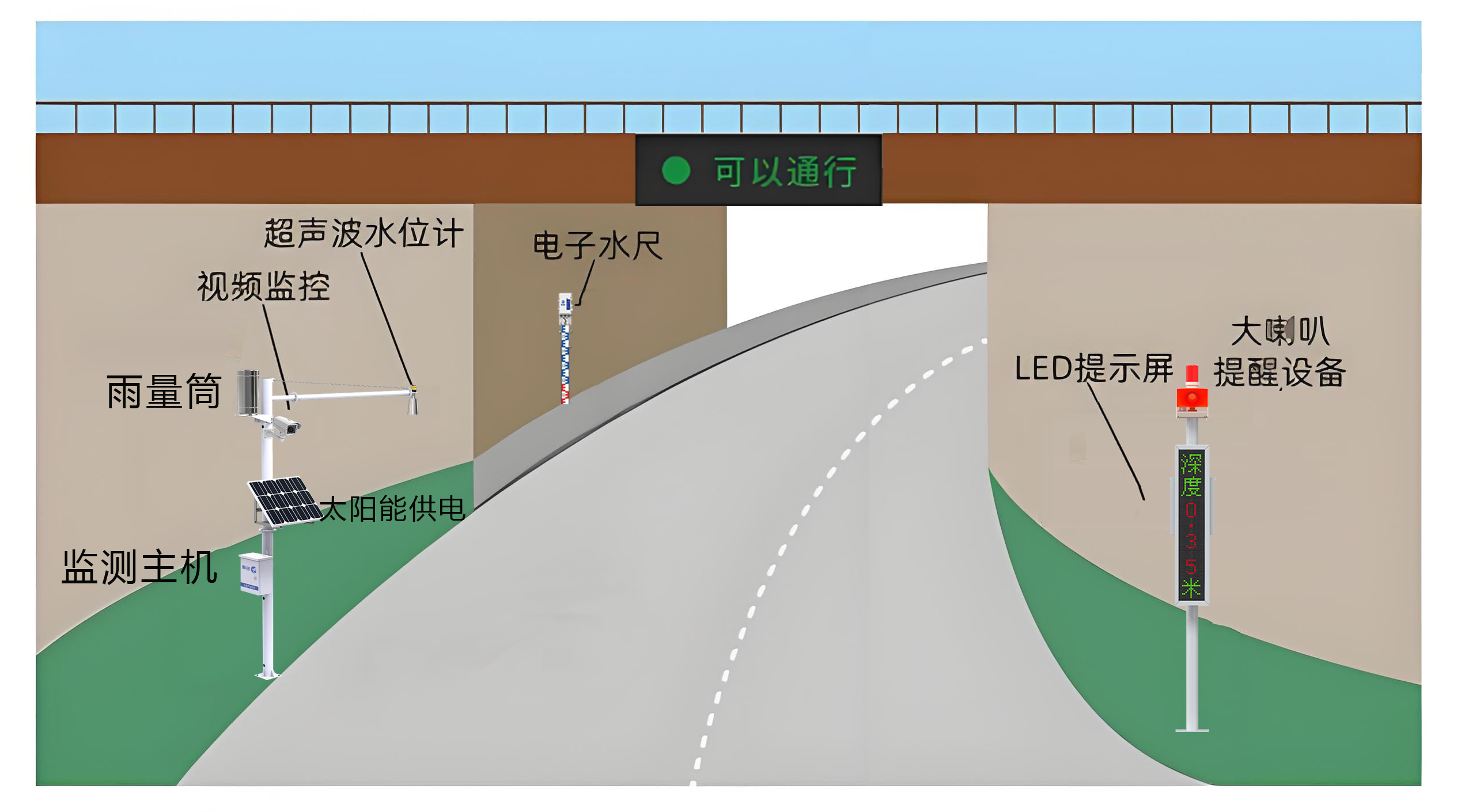 立交桥涵洞积水监测预警系统组成:由监控摄像机、液位计、监测主机、电子水尺、预警大屏、预警喇叭等硬件设施组成。