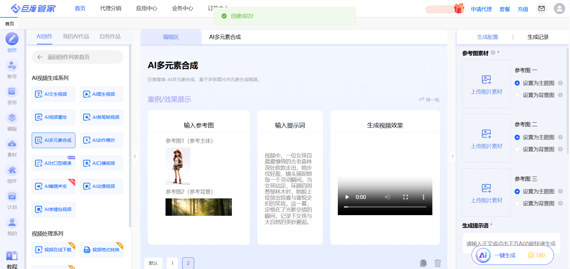 首先登场的是巨推管家AI多元素合成视频工具。这款软件以其强大的智能化功能脱颖而出,用户只需简单上传所需素材,系统便能自动分析并匹配最合适的剪辑方案,大大节省了时间与精力。同时,它还支持高度自定义的模板设计,满足不同用户的个性化需求。此外,其内置的海量音乐库和特效资源也为作品增添了不少亮点。不过,对于追求极致专业度的创作者来说,可能会觉得部分高级功能的操作界面略显复杂。