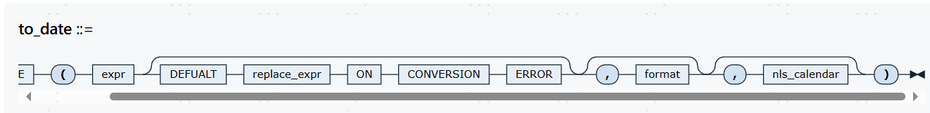 to_date::= TO_DATE "("expr [DEFUALT replace_expr ON CONVERSION ERROR] ["," format][","nls_calendar] ")"TO_DATE函数将expr的值转换为DATE类型数据,返回值格式为DATE类型数据的默认格式。