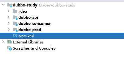 然后分别创建三个子模块,分别为dubbo-prod,dubbo-api,dubbo-consumer如下图