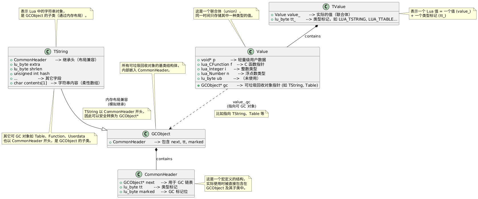 当Lua创造一个可GC对象时(以TString为例),TValue的TValue.tt_ 被设为 ctb(LUA_TSTRING),其 value_.gc 字段指向一个TString,而该对象也将以 CommonHeader 开头,作为 GCObject 的子类而被视为可GC了