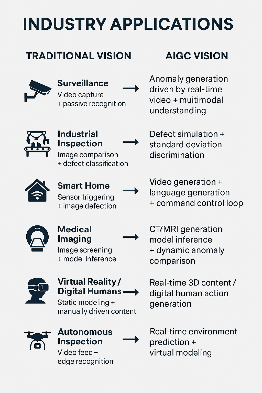 AIGC 与实时视频感知的结合,正在重构多个行业的感知—理解—决策链条。传统视觉系统往往以“识别”为终点,而引入 AIGC 后,视觉系统开始具备“生成—预测—重构”能力,显著提升了智能体的响应效率与场景适应性。