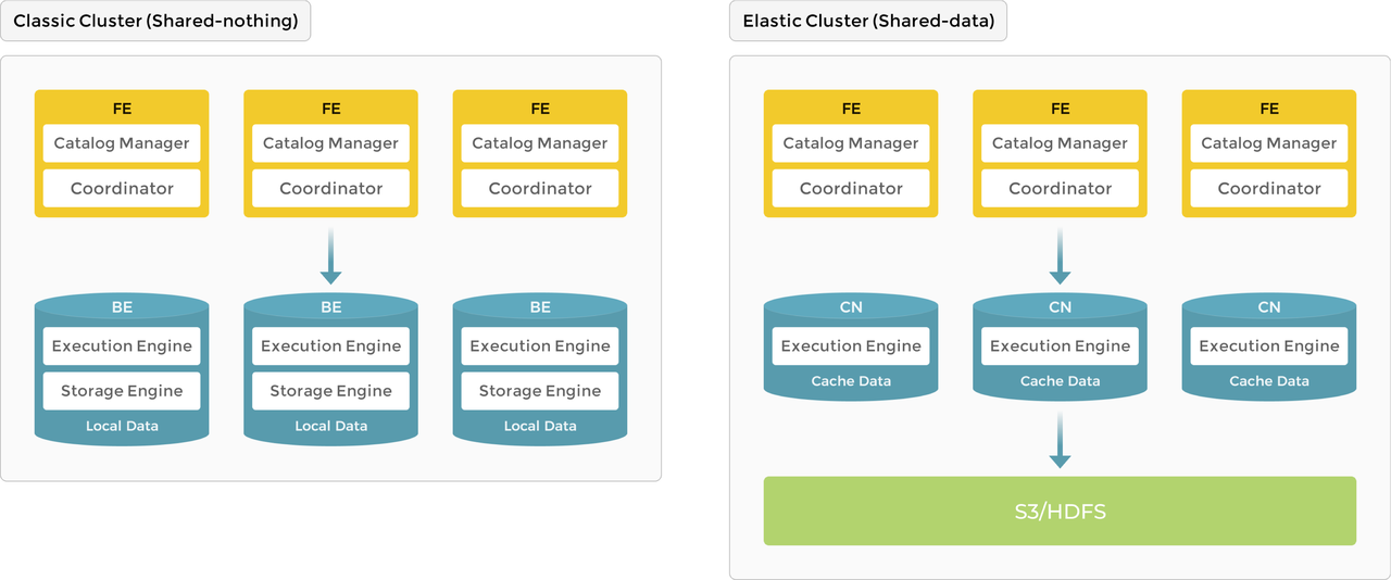 StarRocks 的架构简单,分为前端和后端。前端节点称为 FE。后端节点有两种类型,BE 和 CN (计算节点)。当使用本地存储数据时,需要部署 BE;当数据存储在对象存储或 HDFS 时,需要部署 CN。StarRocks 不依赖任何外部组件,简化了部署和维护。节点可以水平扩展而不影响服务正常运行。此外,StarRocks 具有元数据和服务数据副本机制,提高了数据可靠性,有效防止单点故障 (SPOF)。