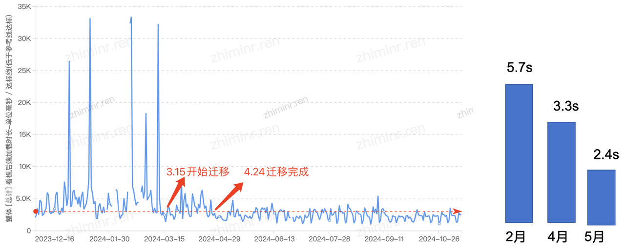 自 3 月份起,QBI 看板项目踏上了逐步迁移的征程,并在 4 月份圆满完成了整个迁移过程,随着迁移工作的持续推进,QBI 看板的查询性能越来越好。具体来看,2 月份时,查询 P95 还徘徊在 5.7 秒的较高水平;而到了 4 月份,随着迁移工作的逐步完成,查询 P95 已经显著下降至 3.3 秒;5 月份,这一指标进一步优化至 2.4 秒,实现了近乎翻倍的性能提升。