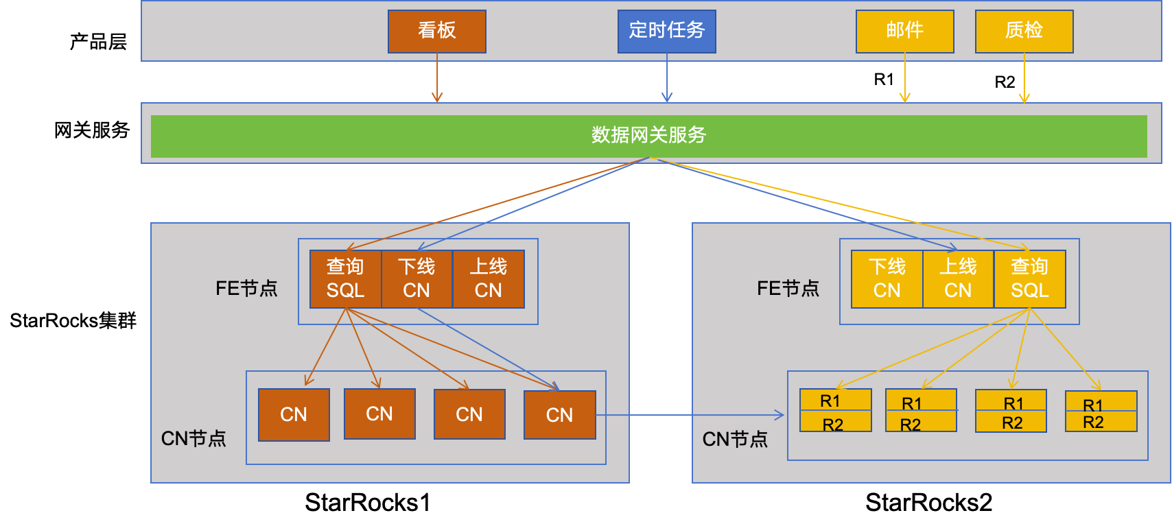 (1)搭建了两个独立的集群( StarRocks1 和 StarRocks2)。看板、邮件服务均接入统一的查询服务,该服务根据业务类型智能地路由到不同的集群(看板服务路由到 StarRocks1,邮件服务路由到 StarRocks2),从而实现了物理层面的隔离。