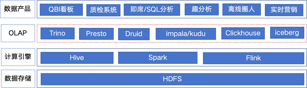 去哪儿网的数据平台为了满足各业务线的看数、取数、用数需求,沉淀出多种数据产品,包括 QBI 看板、质检系统、即席 /SQL 分析、趣分析、离线圈人、实时营销等。这些数据产品依赖于多种计算引擎和数据存储来满足不同的业务场景需求。例如: