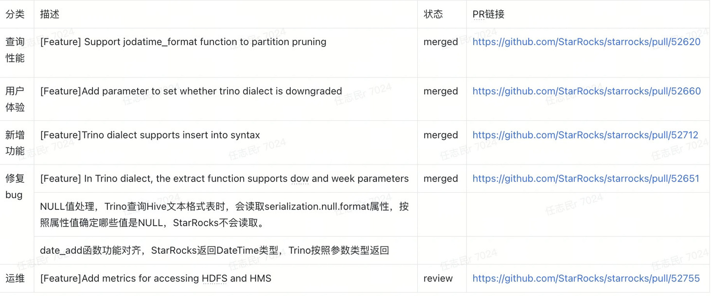 在 StarRocks 的落地过程中,我们对 StarRocks 做了改造,包括提高 Trino 语法兼容率( 90% -> 99% );改造优化器支持语法裁剪;增加自定义参数、自定义指标,提高集群的自我保护机制,并向社区提交多个 PR。