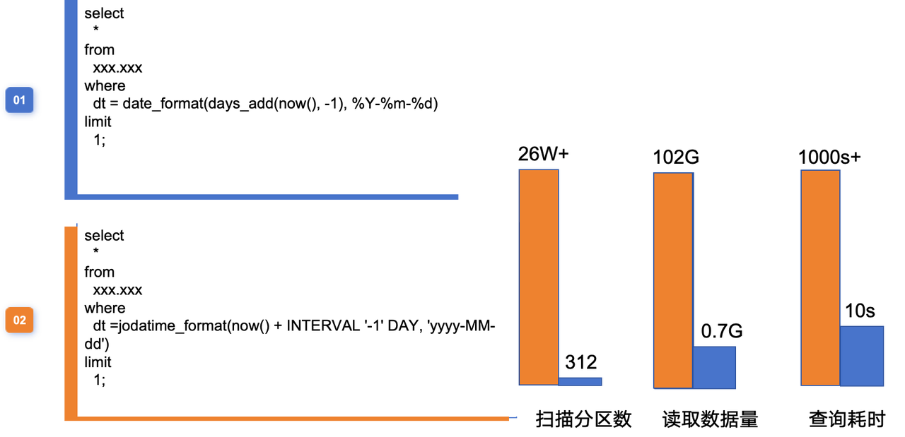 如下图,两个 SQL 语义相同,查询 Hive 表的昨天分区的一条数据,但是执行情况却相差很大,包括扫描的分区数、读取的数据量、以及最终的查询耗时。